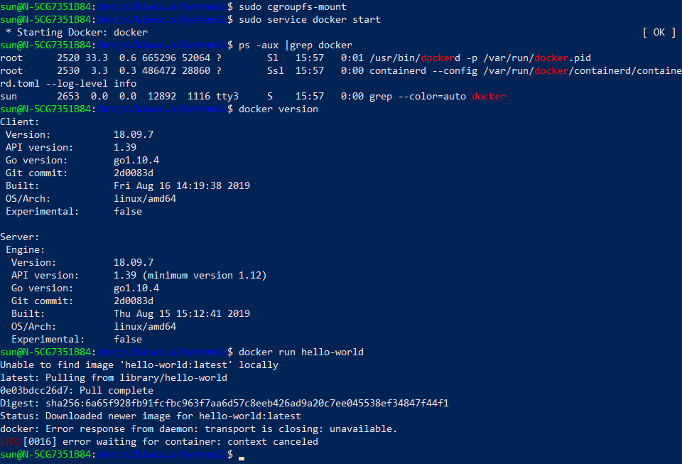 显示如上信息,就表示可以正常使用了,需要注意的是每次电脑重启后先执行cgroupfs-mount再启动docker服务,目前并不完善。