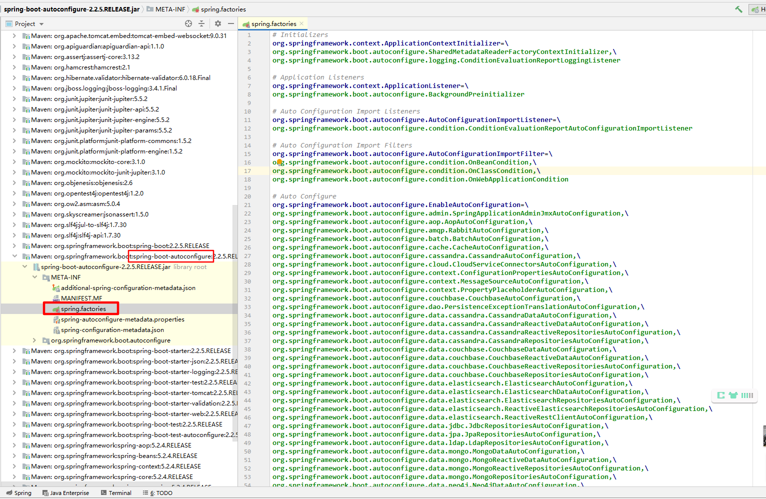 打开 spring.factories , 看到了很多自动配置的文件;这就是自动配置根源所在!